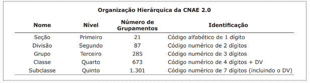 Como já dito, a versão em vigor da CNAE é 2.2, mas como ainda não foi lançado o documento online oficial de sua estrutura, estamos nos guiando pelo modelo hierárquico da CNAE 2.0, que nesse ponto estrutural não sofreu mudanças.