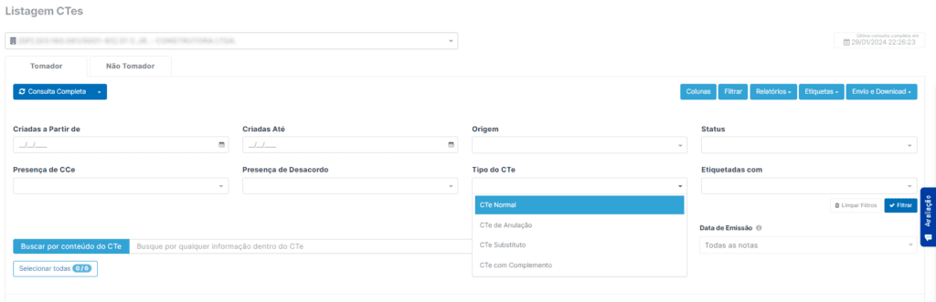 Na plataforma Qive, você também pode filtrar os CTes que tenham sido manifestados pelo seu CNPJ, na opção “Filtrar”. Dentre as opções de filtro, você também pode selecionar a opção “Tipo do CTe”, que auxilia na identificação dos documentos de anulação e substitutos que tenham sido emitidos contra o seu CNPJ após a manifestação.