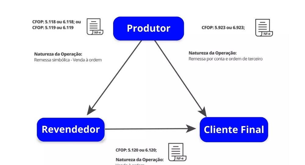 Se o consumidor final estiver no mesmo estado do produtor, o CFOP utilizará o CFOP <5.923>. Por outro lado, se o consumidor estiver em outro estado, o produtor deverá usar o CFOP <5.923 / 6.293> – Remessa de mercadoria por conta e ordem de terceiros, em venda à ordem.