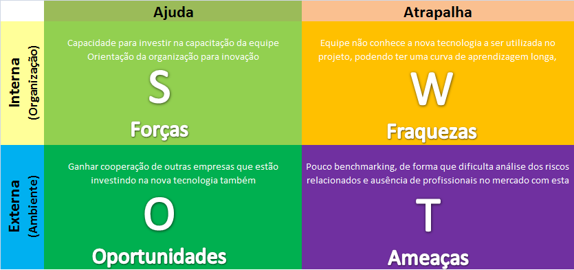 Bastante simples de ser executada, a matriz SWOT se resume a quatro quadros dispostos de maneira a formar um quadro maior.