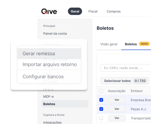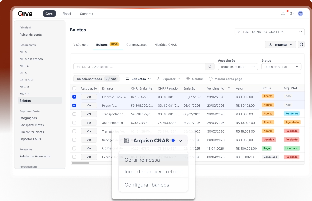 A Qive gera o CNAB de remessa para enviar boletos em lote ao banco e lê o CNAB de retorno para atualizar automaticamente o status de cada pagamento.