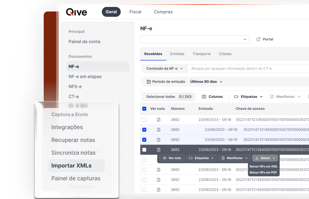 Para assegurar o compliance fiscal e financeiro, a Qive só processa documentos que estejam no formato XML, garantindo informações válidas e seguras para a sua equipe.