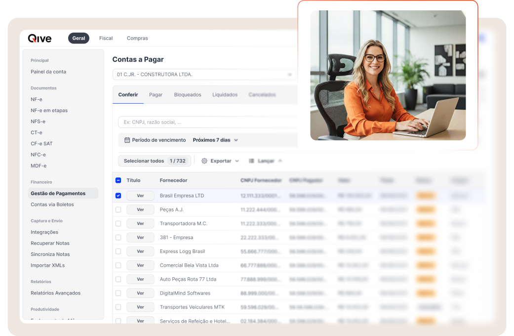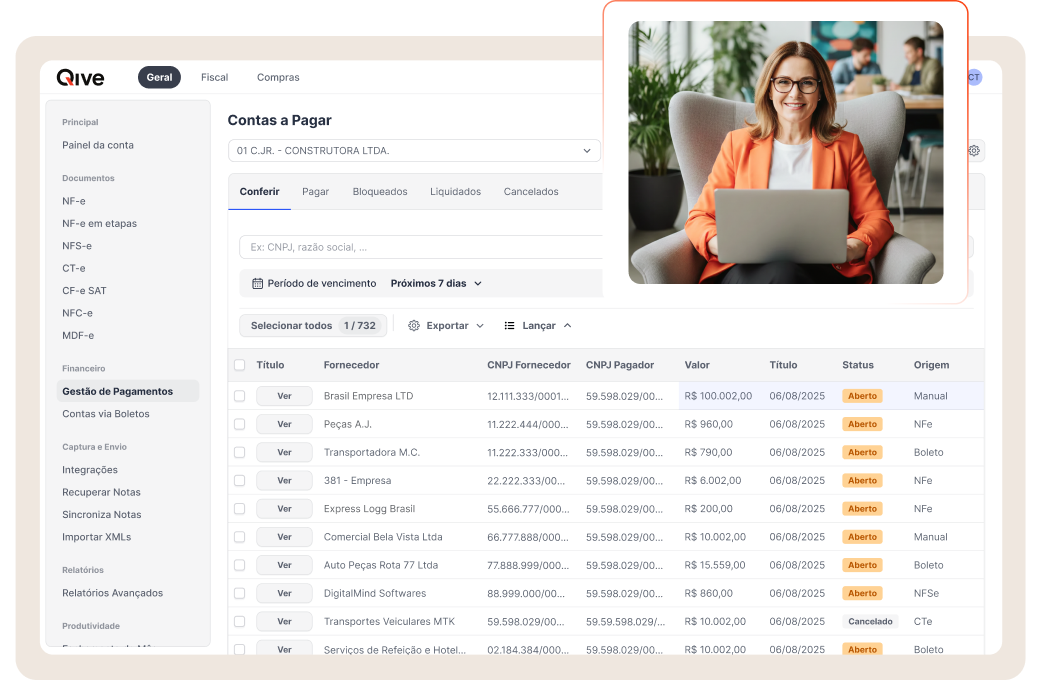 A Qive oferece uma plataforma completa para o Contas a Pagar, composta por soluções integradas para os desafios financeiros e fiscais: